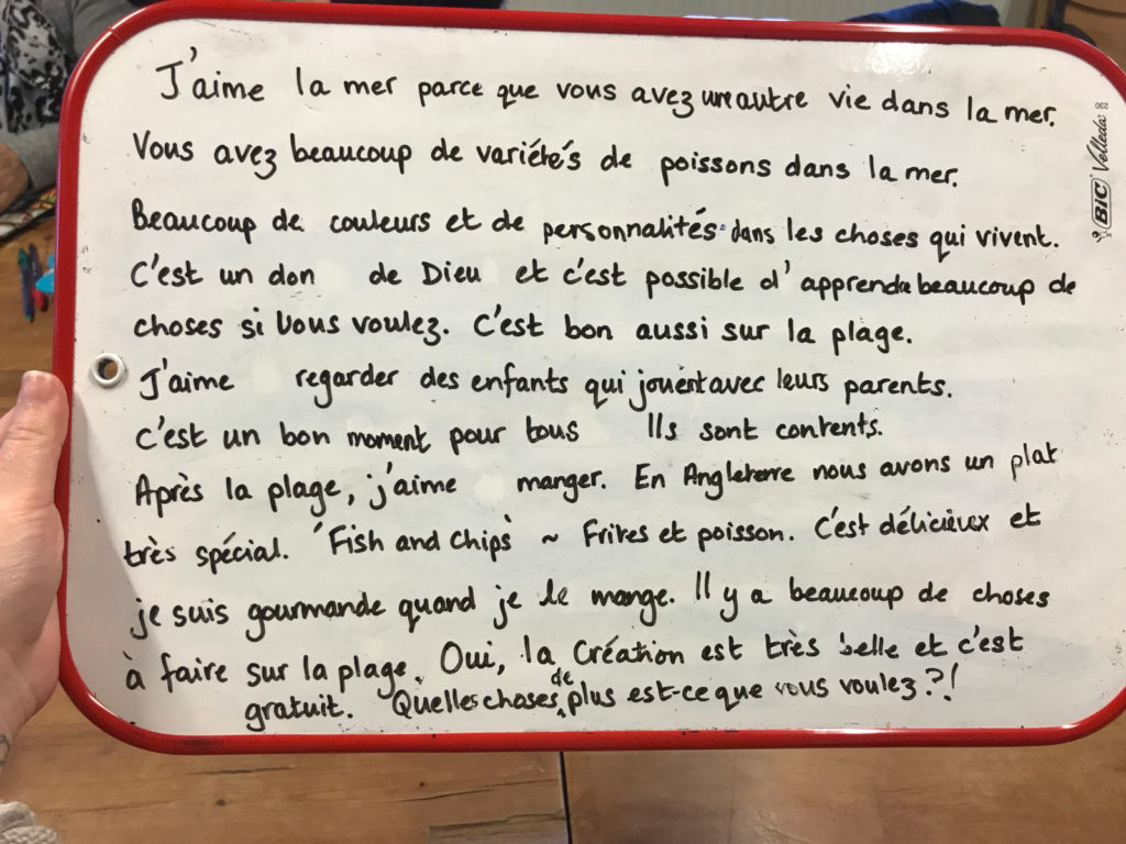 Après la plage, j’aime manger. En Angleterre, nous avons un plat très spécial « Fish and Chips » (frites et poisson). C’est délicieux et je suis gourmande quand je le mange.
