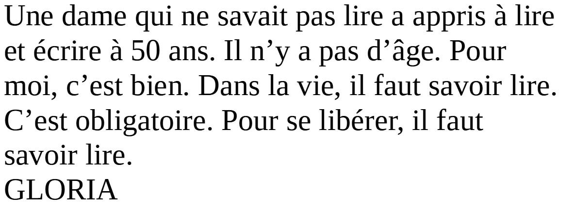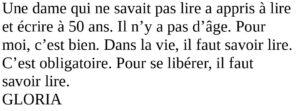 Aline LE GULUCHE a dit-elle « gagné sa liberté d’expression et une vraie place dans la société ». Au-delà de l’illettrisme, c’est le parcours d’une femme qui s’est battue pour devenir libre.