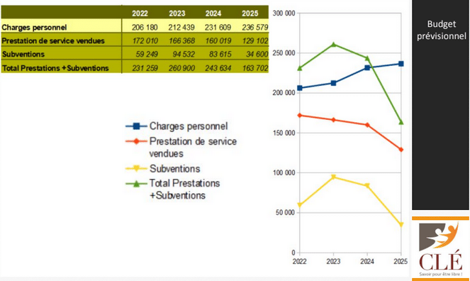 Le déficit prévu pour 2025 est considérable : – 70 000 € (sur un budget de 280 000 €). Il pourrait encore augmenter, car il tient compte de demandes d’appels à projets et de subventions pour lesquelles les réponses peuvent être positives ou négatives.