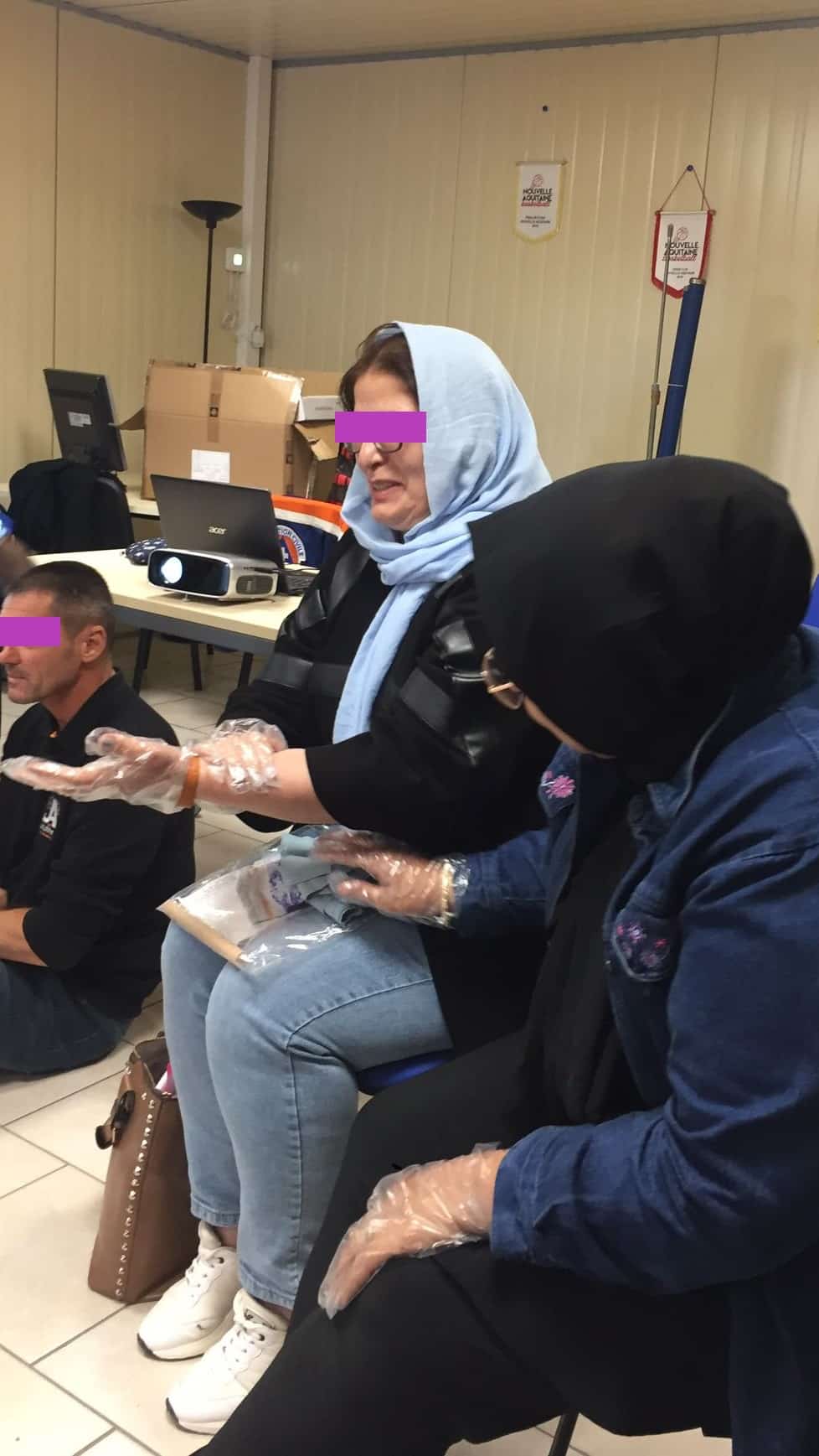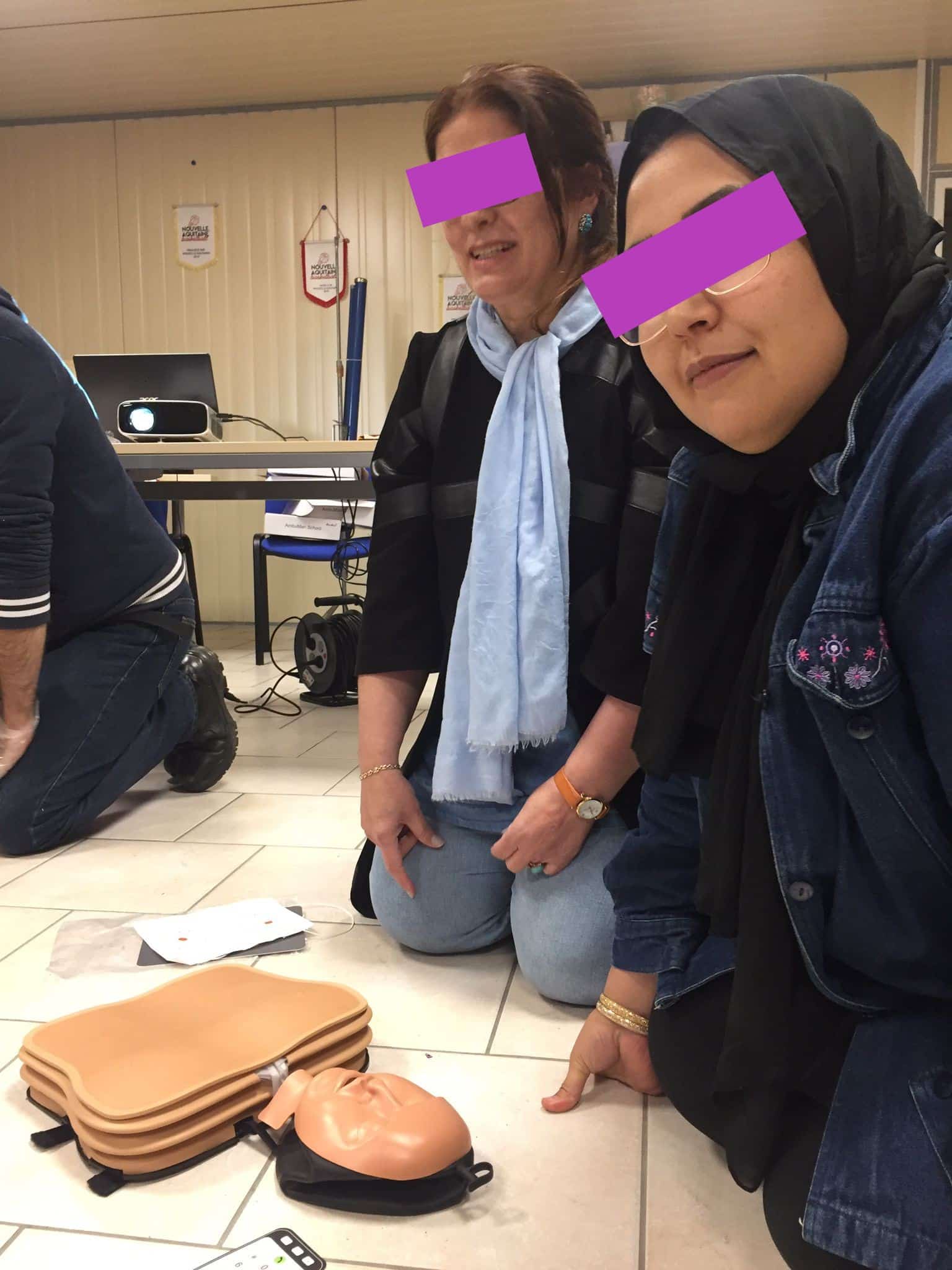 Les apprenant.e.s des ateliers de conversation du vendredi matin ont appris à faire des points de compression, des garrots, mais également à mettre une personne inconsciente en PLS et à masser une personne ne respirant plus.