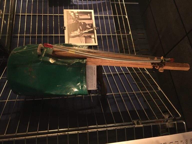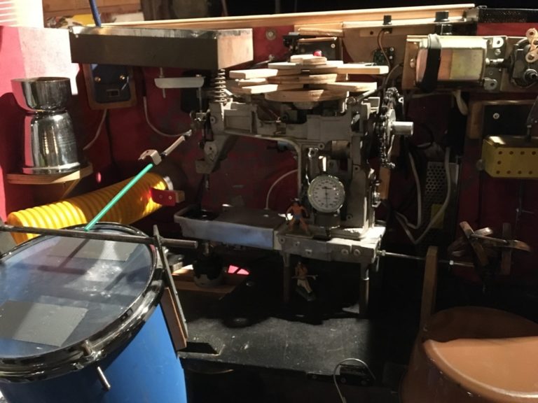 Ensuite, Eric Pelletier, musicien du Collectif Gonzo, a mis une de ses « machines » en route et la magie a opéré ! De la musique avec des gaines de machines à laver, des claquettes, des boîtes à camembert, des conserves, du fil de pêche, des manches à balai et même des pièces démontées d’imprimante !
