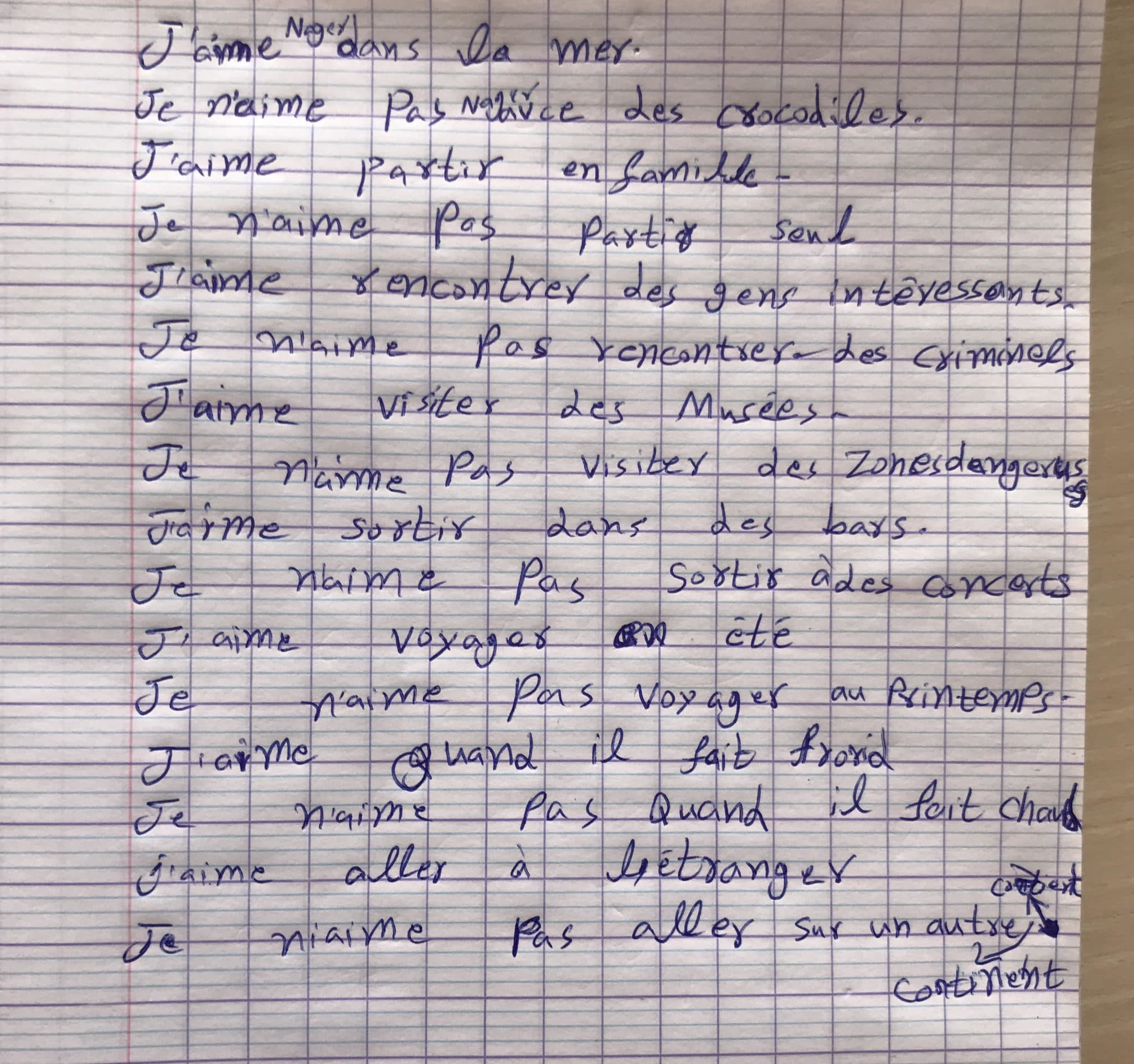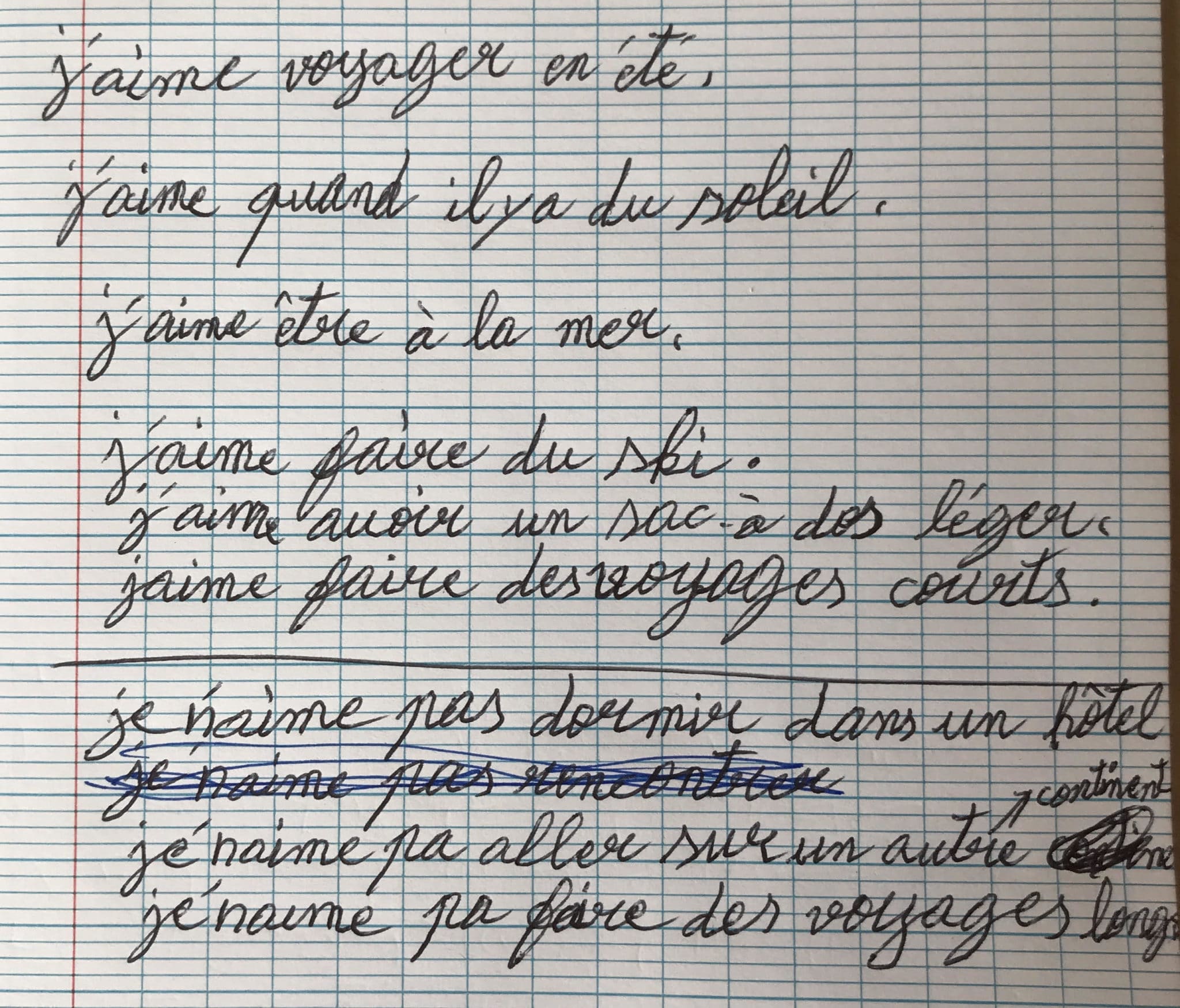 J’aime aller chez moi et à l’étranger.