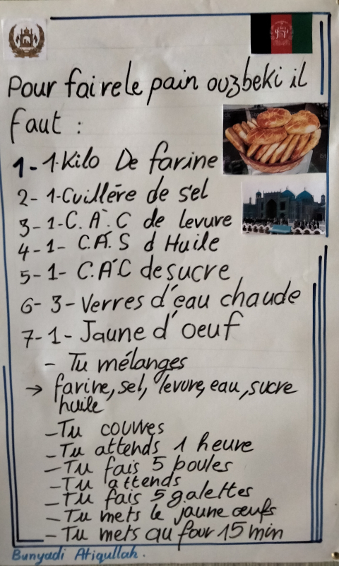 Atiqullah a offert du pain ouzbek à la bénévole qui lui fait cours deux fois par semaine. Ensemble, ils en ont profité pour écrire la recette…