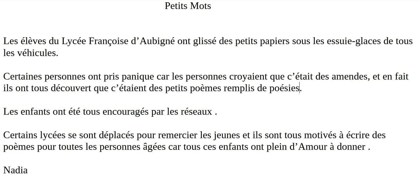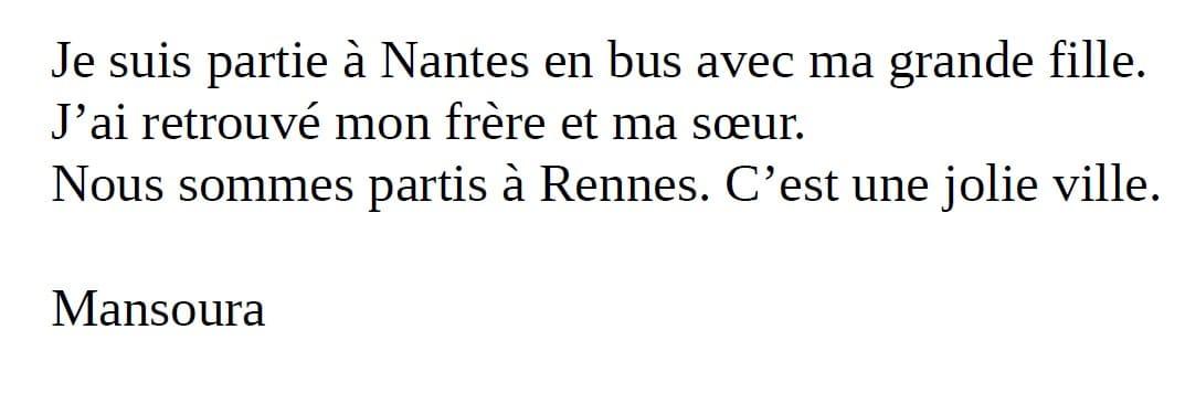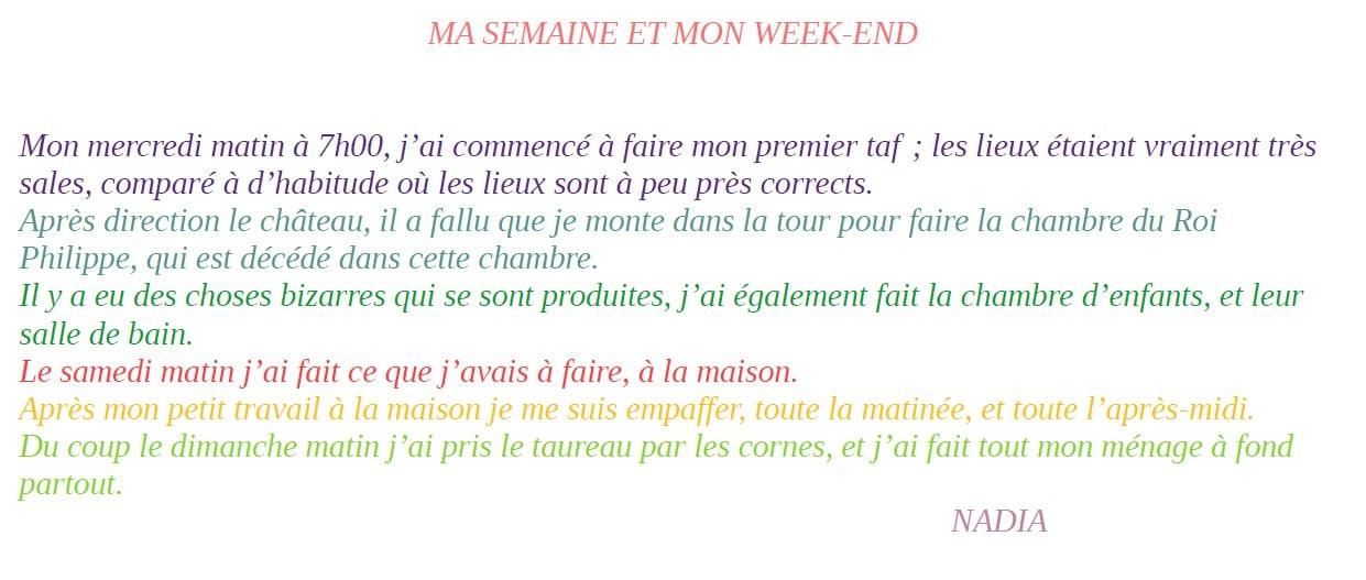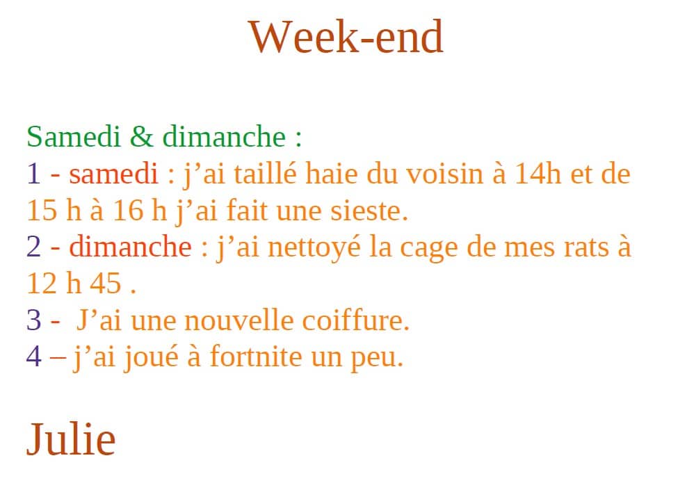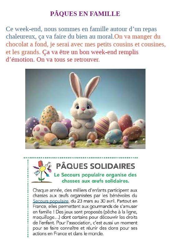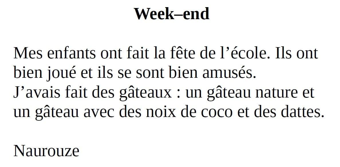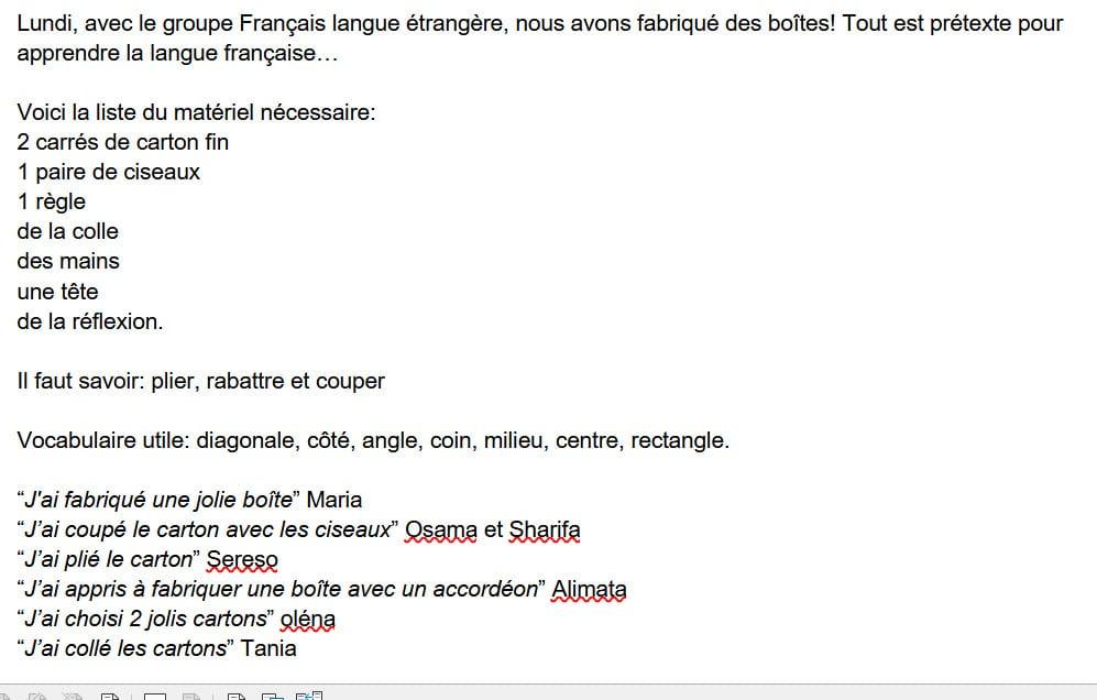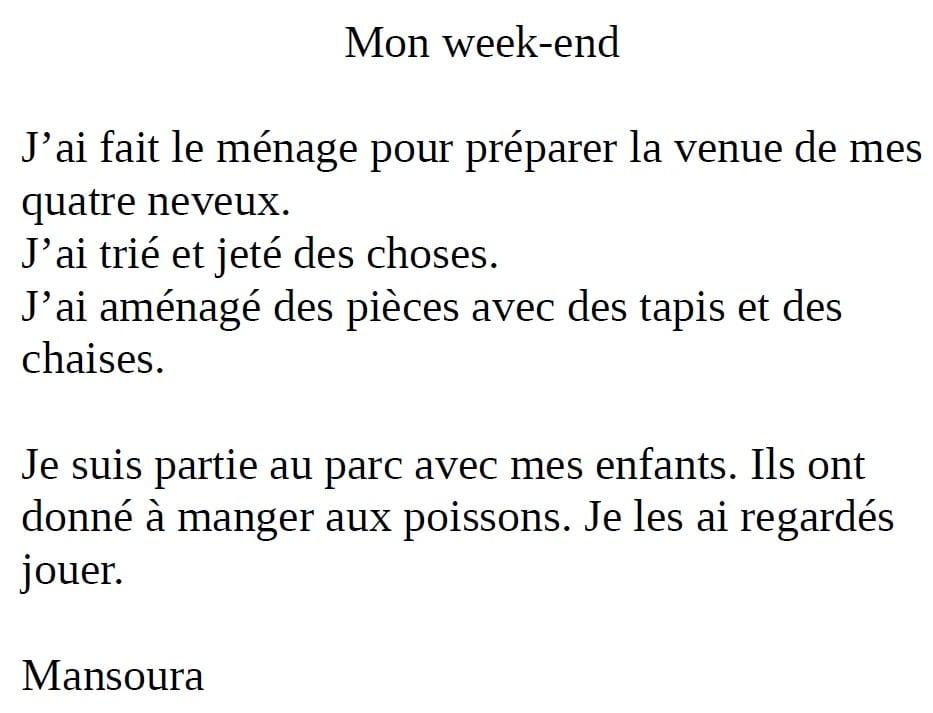 14 Juin 2024 Textes personnels des apprenant.e.s /11 par JPChevalier | Classé dans : Actualités, Réalisations des apprenants | 0 Cliquer sur les textes et les images pour les agrandir et pour les lire… Souvent, le lundi, nous parlons de notre week-end. Nadia et Patricia proposent des textes à partir des Vite Lu du mois de mai. En avril 2024, nous avons lu le journal Vite Lu. Nous avons parlé de l’actualité. Voici ce que nous retenons: En mars 2024, nous avons lu le journal Vite Lu. Voici ce que nous retenons: Lundi 15 janvier 2024, avec le groupe Français langue étrangère, nous avons fabriqué des boîtes! Tout est prétexte pour apprendre la langue française… Pour retrouver les textes libres des apprenant.e.s du 18 juillet au 31 décembre 2023: Cliquez ici Pour retrouver les textes libres des apprenant.e.s du 1er mai au 17 juillet 2023: Cliquez ici Pour retrouver les textes libres des apprenant.e.s du 1er janvier au 1er mai 2023: Cliquez ici Pour retrouver les textes libres des apprenant.e.s du 28 octobre au 31 décembre 2022: Cliquez ici Pour retrouver les textes libres des apprenant.e.s du 5 juillet au 27 octobre 2022: Cliquez ici Pour retrouver les textes libres des apprenant.e.s du 9 mars au 4 juillet 2022: Cliquez ici Pour retrouver les textes libres des apprenant.e.s du 21 décembre 2021 au 8 mars 2022: Cliquez ici Pour retrouver les textes libres des apprenant.e.sdu 15 septembre 2021 au 20 décembre: Cliquez ici Pour retrouver les textes libres des apprenant.e.sdu 1er mai 2021 au 15 septembre 2021: Cliquez ici Pour retrouver les textes libres des apprenant.e.s du 27 novembre 2020 à fin avril 2021: Cliquez ici