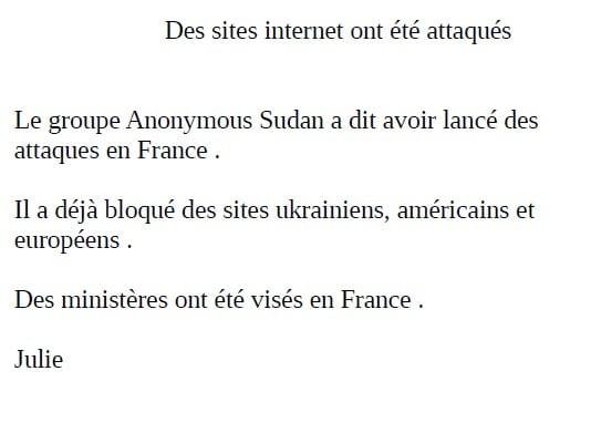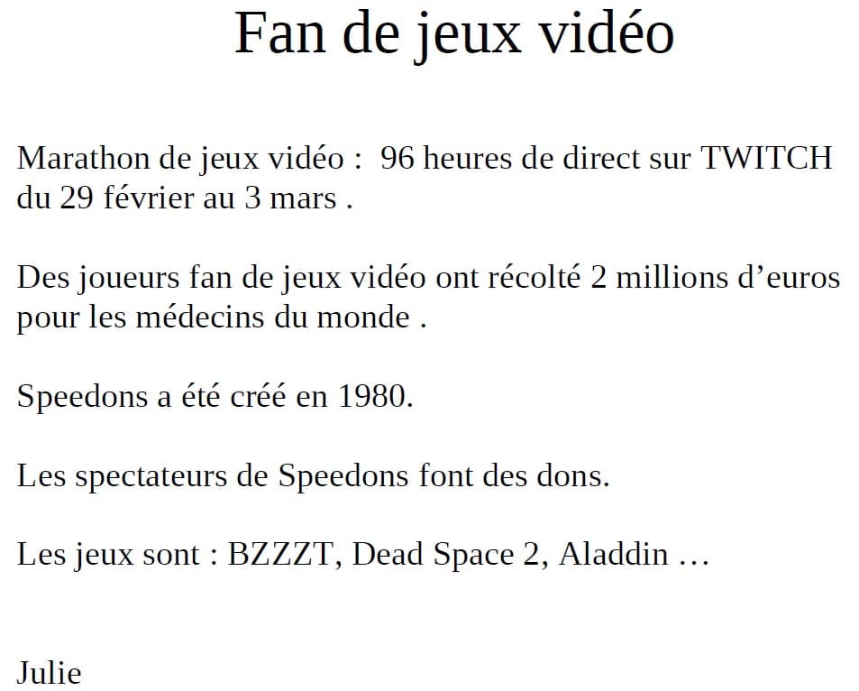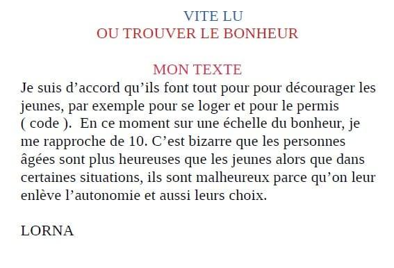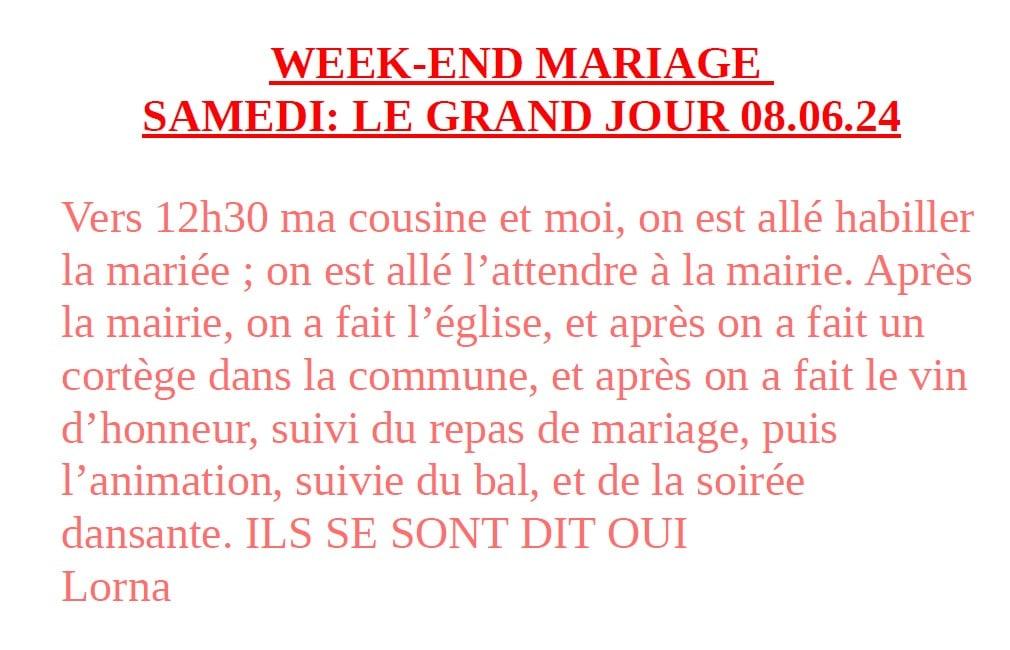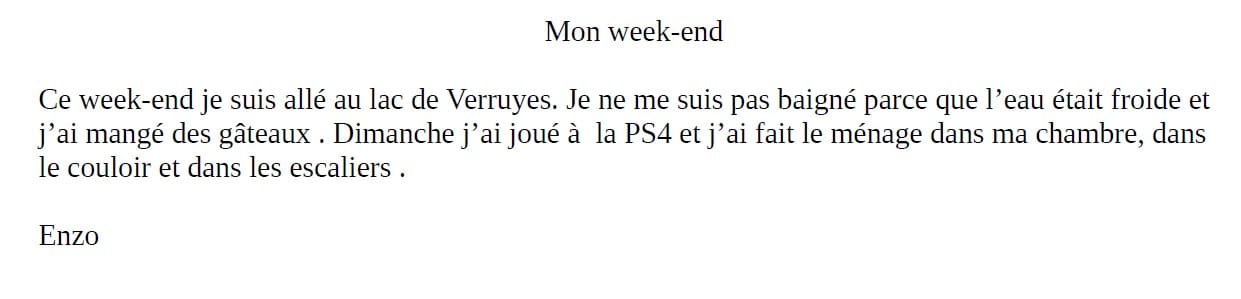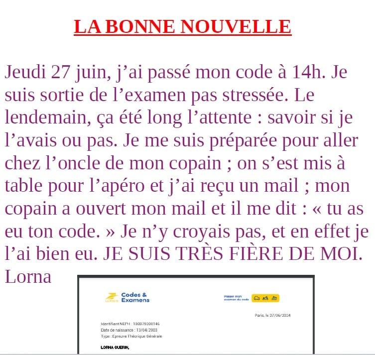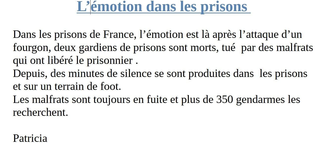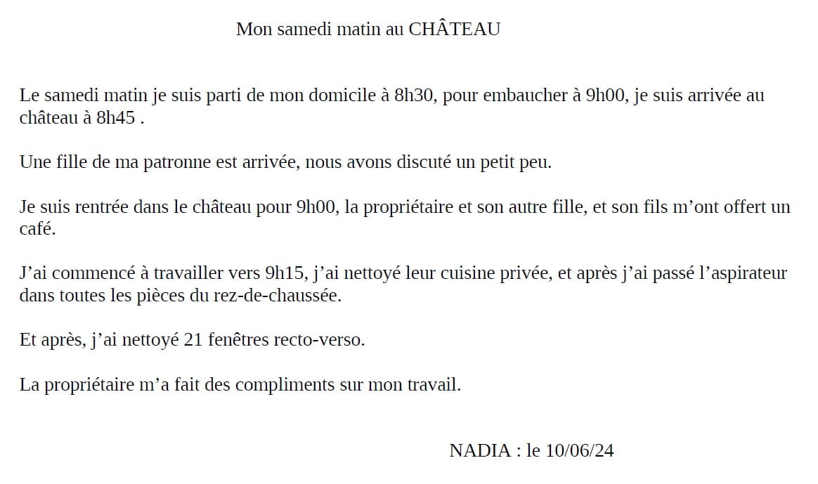 14 Juin 2024 Textes personnels des apprenant.e.s /11 par JPChevalier | Classé dans : Actualités, Réalisations des apprenants | 0 Cliquer sur les textes et les images pour les agrandir et pour les lire… Souvent, le lundi, nous parlons de notre week-end. Nadia et Patricia proposent des textes à partir des Vite Lu du mois de mai. En avril 2024, nous avons lu le journal Vite Lu. Nous avons parlé de l’actualité. Voici ce que nous retenons: En mars 2024, nous avons lu le journal Vite Lu. Voici ce que nous retenons: Lundi 15 janvier 2024, avec le groupe Français langue étrangère, nous avons fabriqué des boîtes! Tout est prétexte pour apprendre la langue française… Pour retrouver les textes libres des apprenant.e.s du 18 juillet au 31 décembre 2023: Cliquez ici Pour retrouver les textes libres des apprenant.e.s du 1er mai au 17 juillet 2023: Cliquez ici Pour retrouver les textes libres des apprenant.e.s du 1er janvier au 1er mai 2023: Cliquez ici Pour retrouver les textes libres des apprenant.e.s du 28 octobre au 31 décembre 2022: Cliquez ici Pour retrouver les textes libres des apprenant.e.s du 5 juillet au 27 octobre 2022: Cliquez ici Pour retrouver les textes libres des apprenant.e.s du 9 mars au 4 juillet 2022: Cliquez ici Pour retrouver les textes libres des apprenant.e.s du 21 décembre 2021 au 8 mars 2022: Cliquez ici Pour retrouver les textes libres des apprenant.e.sdu 15 septembre 2021 au 20 décembre: Cliquez ici Pour retrouver les textes libres des apprenant.e.sdu 1er mai 2021 au 15 septembre 2021: Cliquez ici Pour retrouver les textes libres des apprenant.e.s du 27 novembre 2020 à fin avril 2021: Cliquez ici