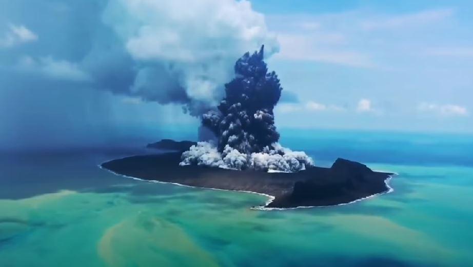 Sur une île de Tonga, un volcan est entré en éruption. Il y a eu une explosion de 20 à 30 km de hauteur. Il y a eu beaucoup de fumée.