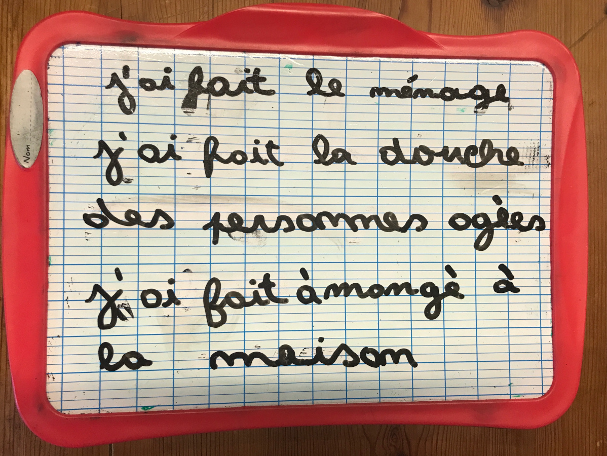 J’ai fait le ménage. J’ai fait la douche des personnes âgées. J’ai fait à manger à la maison.
