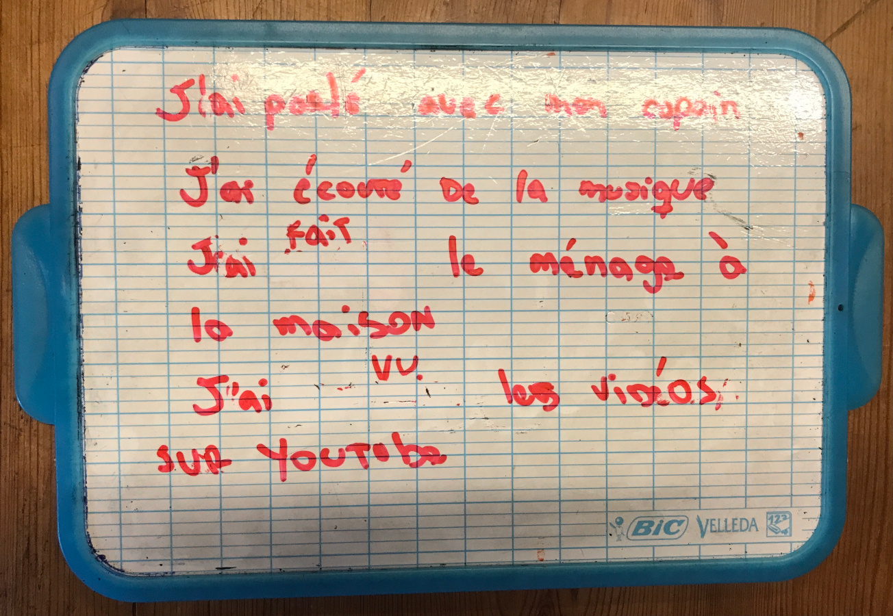 J’ai parlé avec mon copain. J’ai écouté de la musique. J’ai fait le ménage à la maison. J’ai vu des vidéos sur Youtube.