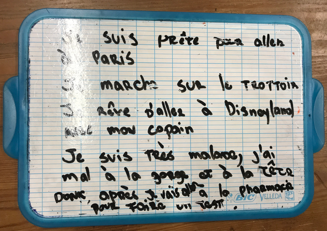 Je suis très malade, j’ai mal à la gorge et à la tête donc après je vais aller à la pharmacie pour faire un test.