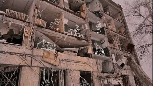 Un bâtiment démoli: il y a des gens chez eux; on les voit comme s’ils étaient vivants. Samina