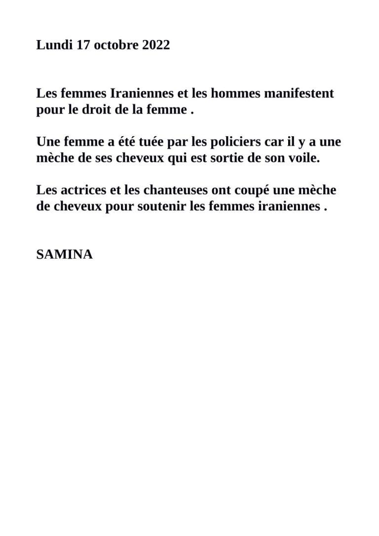 Samina a réagi suite à la lecture d’un article de journal au sujet des femmes en Iran.