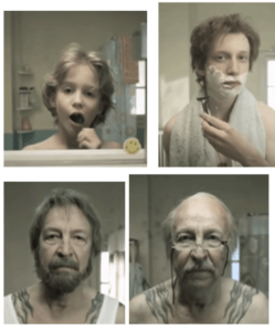 Ensuite, on voit la même personne, dans la même salle de bain mais elle est un peu plus vieille. C’est le garçon qui est déjà un adolescent. Il commence à se raser.