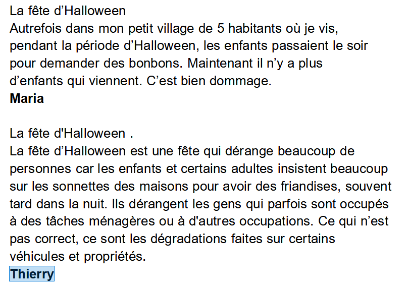 Nous avons lu un texte dans le Vite lu qui parlait de l’histoire de la fête d’Halloween et de son arrivée en France en 1997/1998. Voici ce que Maria et Thierry pensent de cette fête et de cette tradition de faire du porte à porte déguisés en demandant des bonbons: