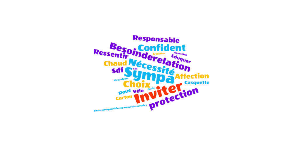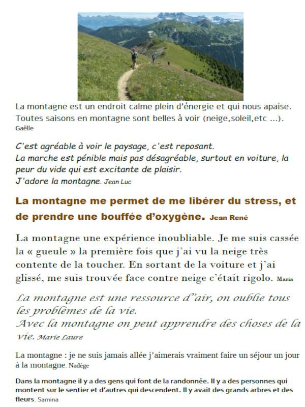 Le lundi matin, pour commencer notre semaine, nous avons laissé les proverbes ou pensées pour écrire simplement à partir de photos en amorce de nos séances. Nous faisons une récolte de mots que l’un(e) de nous met en nuage et écrivons et mettons en page chacun(e) nos avis et sensations.