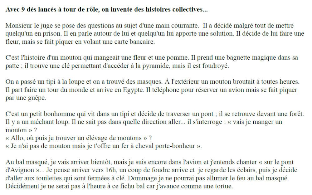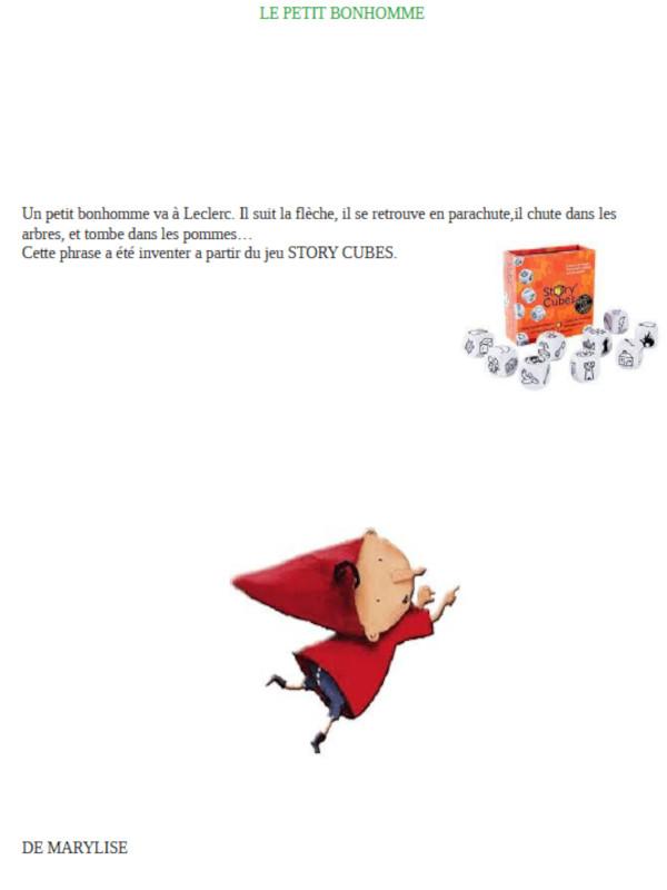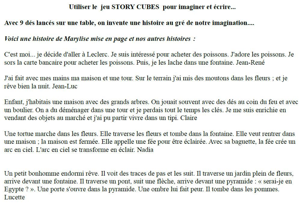 En amorce de nos séances à Secondigny, nous aimons utiliser le jeu « Story cubes ». Cela nous permet d’échanger, de parler, d’imaginer et ensuite de travailler l’écrit et d’utiliser l’ordinateur. Voici quelques-unes de nos histoires individuelles ou collectives. Voici également la mise en page de Marylise.