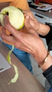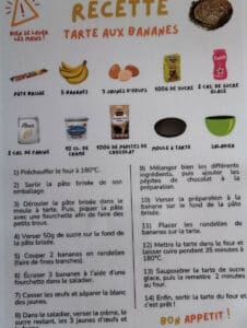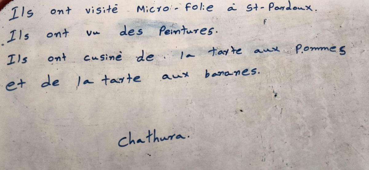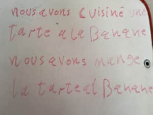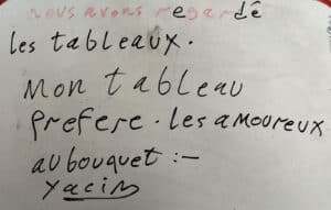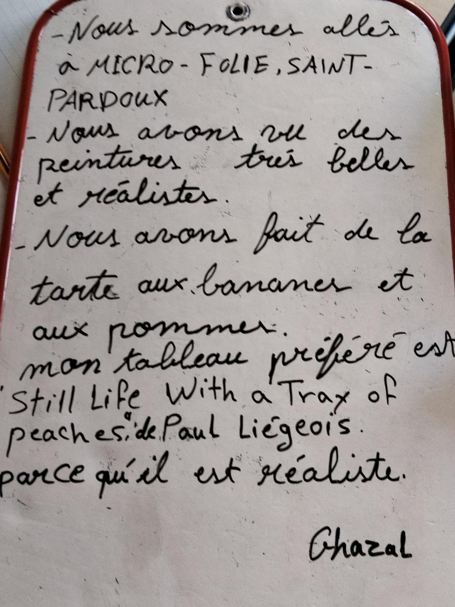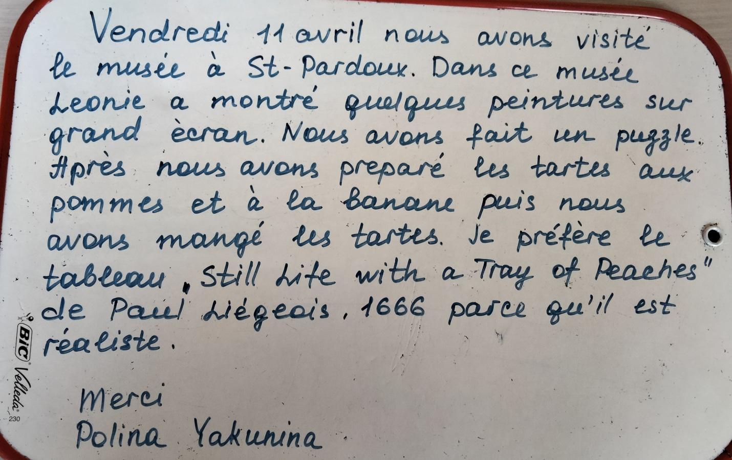 Sur place, Léonie nous attendait. Elle nous a fait découvrir des œuvres d’art dans lesquelles nous avons vu des fruits et des légumes. Elle nous a aussi réservé une surprise en nous proposant de cuisiner des tartes aux fruits et de les déguster! Voici les textes que les apprenants en cours de FLE ont écrit: