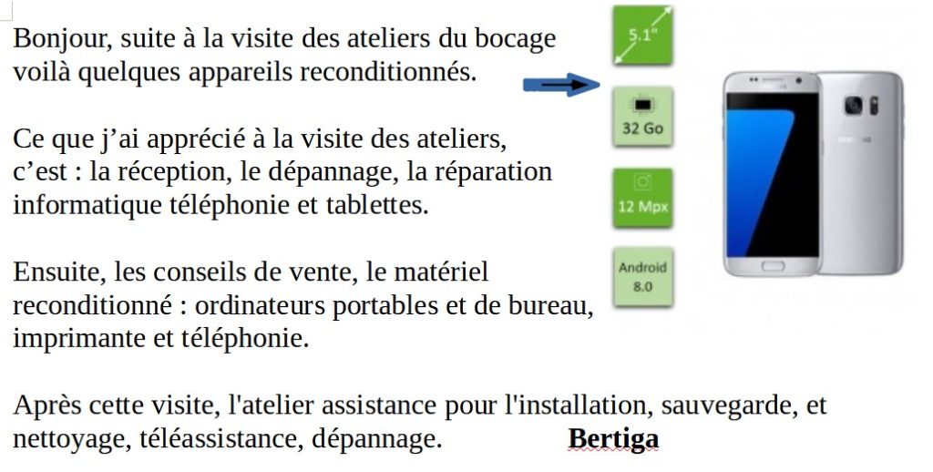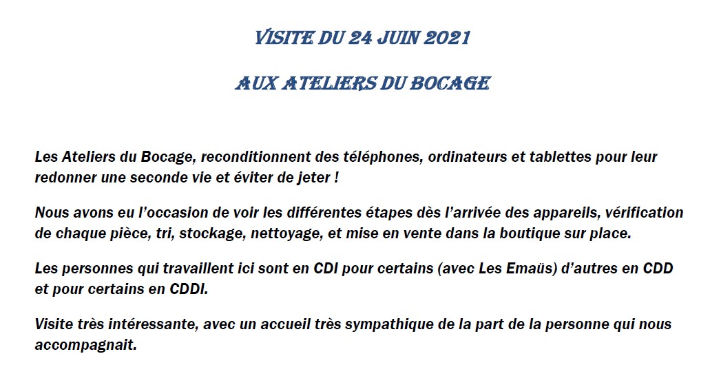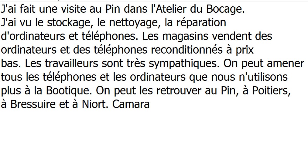 Nous avons parcouru les divers espaces depuis la récupération des objets (ordinateurs et téléphones) jusqu’à la boutique. Occasion unique de mesurer les enjeux de l’utilisation des ordinateurs et téléphones et tous les réflexes à acquérir. De nombreux messages ont été reçus, comme par exemple, la nécessité de penser à déposer un téléphone inutilisé dans une des « bootiques » de notre région car, 10000 téléphones récupérés permettent de créer 1 emploi pour 1 année aux ateliers du bocage ! Quelques apprenants ont ensuite rendu compte de cette visite en produisant un document traitement de texte avec insertion de captures d’écran. Pour se rendre aux Ateliers du Bocage, cliquer ici