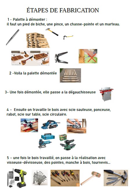 On a visité un chantier d’insertion. On a vu des menuisiers. On a vu des machines. Il y a des tables et des chaises en bois. Akhtar, Diana, Faisal, Hamza et Juma