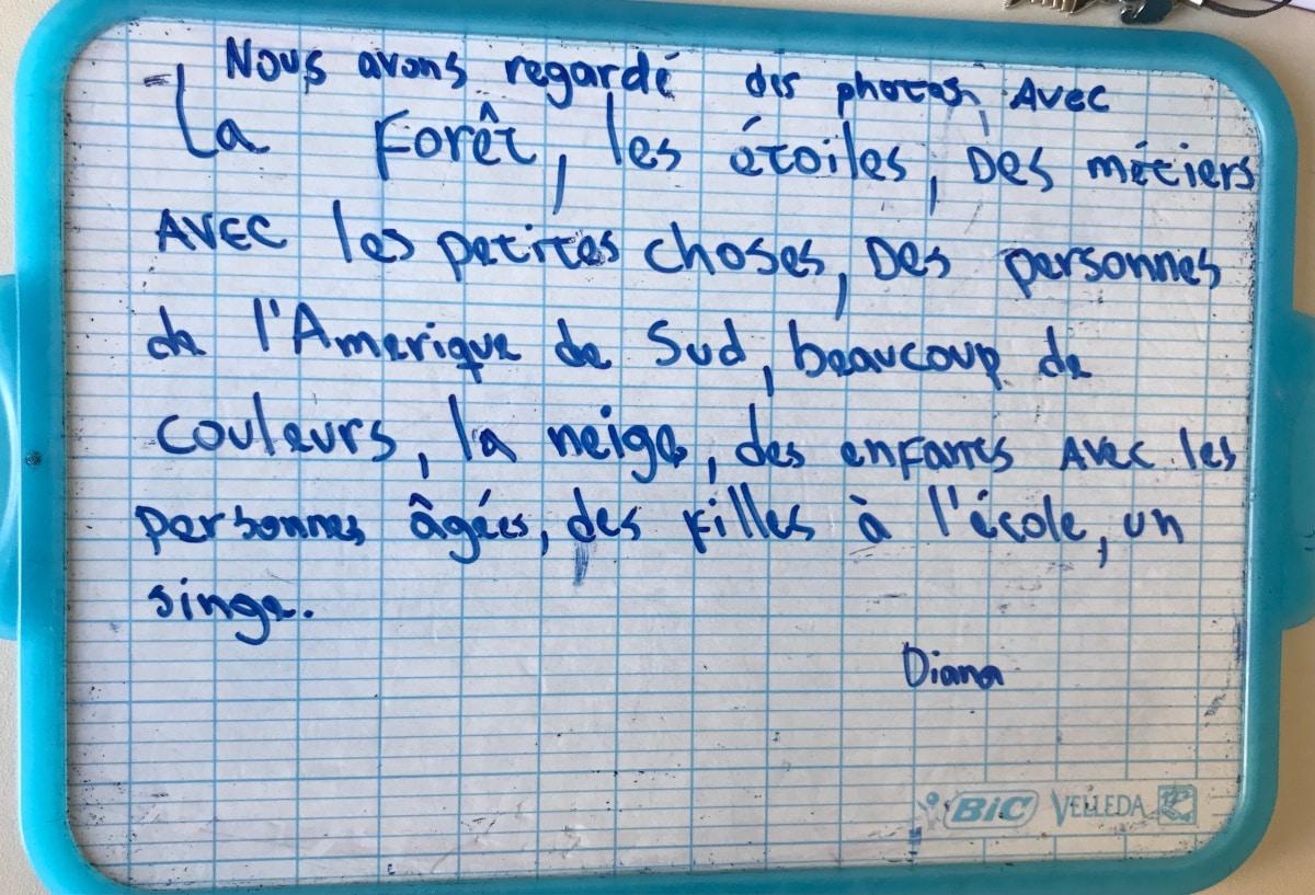 Nous avons regardé des photos avec la forêt, les étoiles, des métiers avec les petites choses, des personnes de l’Amérique du Sud, beaucoup de couleurs, la neige, des enfants avec les personnes âgées, des filles à l’école, un singe. – Diana